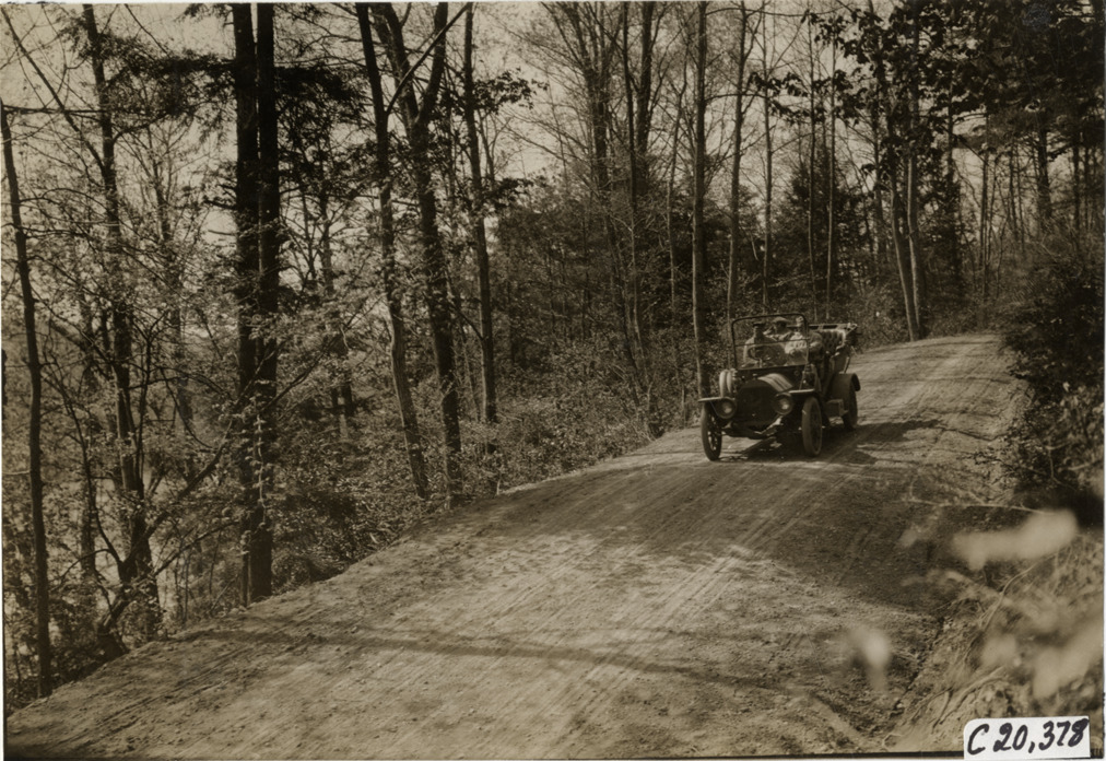 View of motorists in Premier car traveling on dirt road near the Delaware Water Gap during the pathfinding expedition for the 1908 Glidden Tour. Stamped on back: "Photo by N. Lazarnick, 29 West 42nd Street, N.Y., tel. 594 Bryant." Handwritten on back: "Shady roads near Water Gap. Tours--Glidden Tour Pathfinder, 1908."