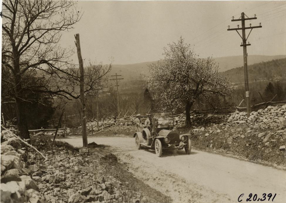 Motorists in Premier automobile traveling on rural road, 1908 Glidden pathfinding expedition