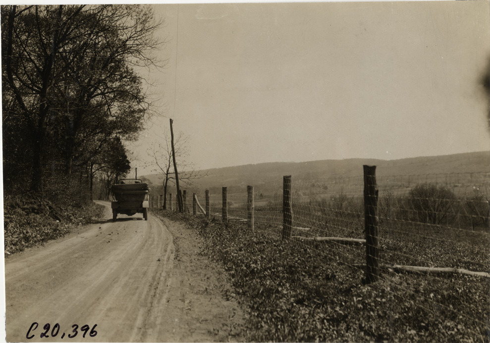 Rear view of motorists in Premier car traveling on rural road near Milford, Pennsylvania during the pathfinding expedition for the 1908 Glidden Tour. Stamped on back: "Photo by N. Lazarnick, 29 West 42nd Street, N.Y., tel. 594 Bryant." Handwritten on back: "Near Milford. Tours--Glidden Tour Pathfinder, 1908."