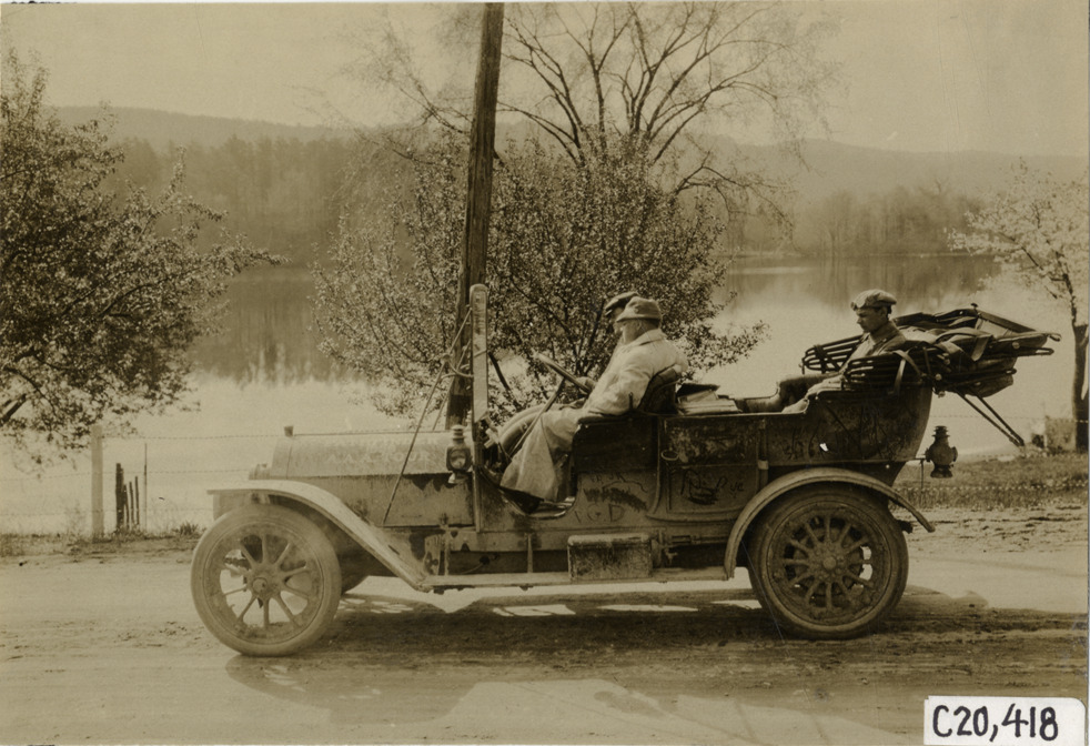 View of motorists in Premier car during the pathfinding expedition for the 1908 Glidden Tour. Lake or river in background. Stamped on back: "Photo by N. Lazarnick, 29 West 42nd Street, N.Y., tel. 594 Bryant." Handwritten on back: "Tours--Glidden Tour Pathfinder, 1908."