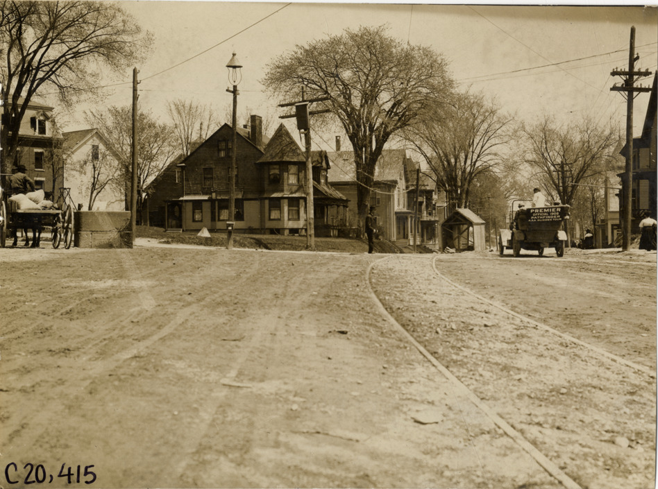View of motorists in Premier car traveling through residential neighborhood during the pathfinding expedition for the 1908 Glidden Tour. Handwritten on back: "Tours--Glidden Tour Pathfinder, 1908."