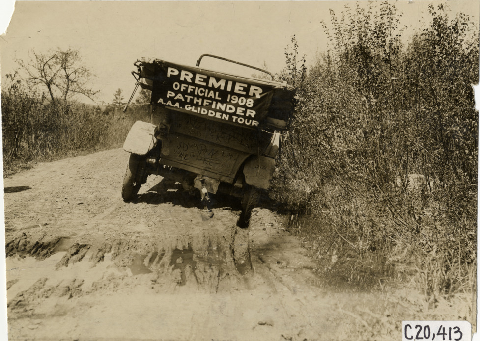 Rear view of Premier car stuck on muddy rural road during the pathfinding expedition for the 1908 Glidden Tour. "Premier, official 1908 pathfinder, A.A.A. Glidden Tour" sign is displayed on back of car. Handwritten on back: "Tours--Glidden Tour Pathfinder, 1908."