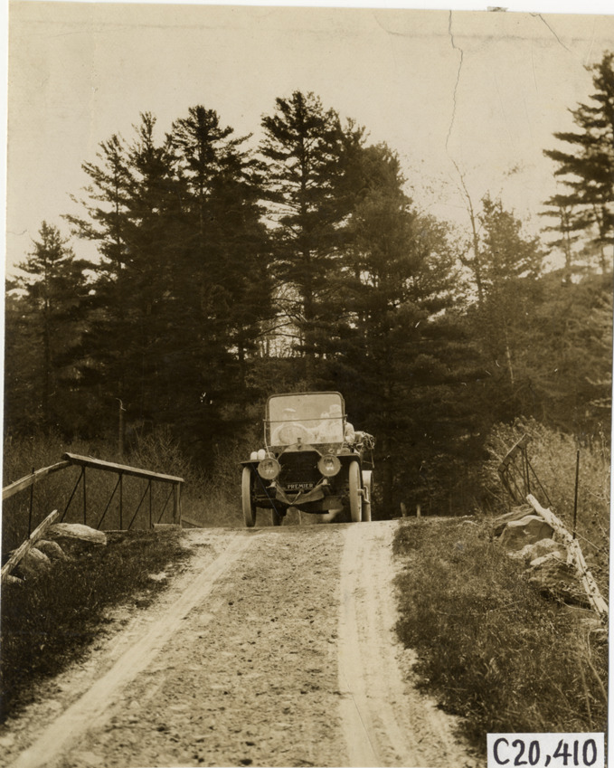 View of motorists in Premier car crossing bridge during the pathfinding expedition for the 1908 Glidden Tour. Handwritten on back: "Tours--Glidden Tour Pathfinder, 1908."