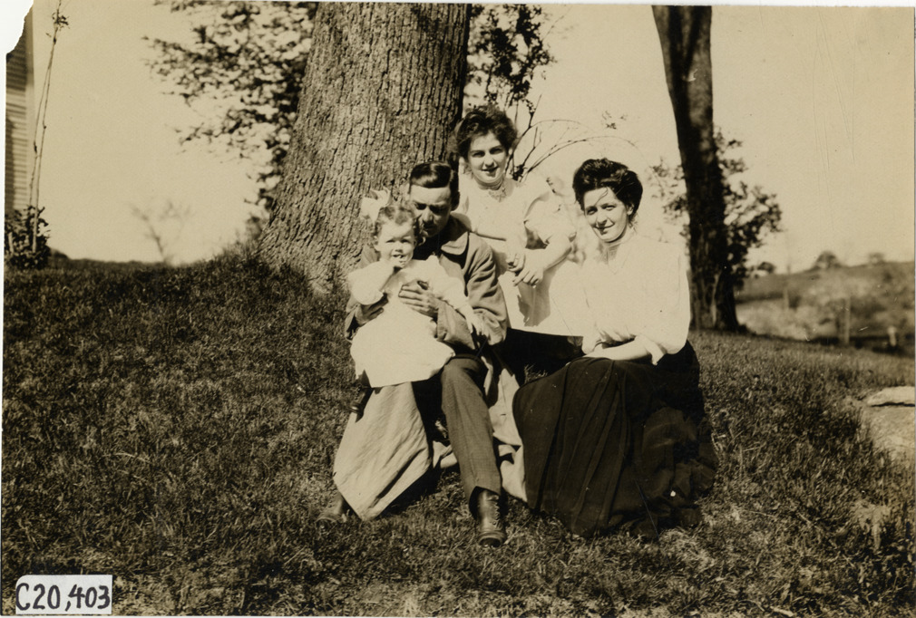 View of two women, a man and a young girl posing outdoors during the pathfinding expedition for the 1908 Glidden Tour. Handwritten on back: "Tours--Glidden Tour Pathfinder, 1908."
