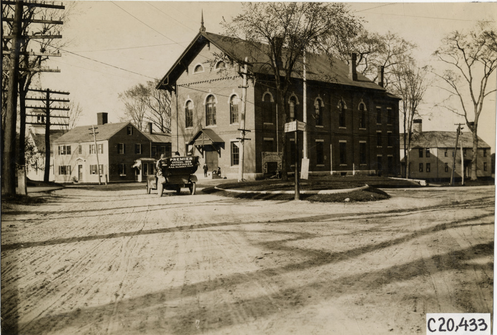 Motorists in Premier automobile passing Italianate brick building, 1908 Glidden pathfinding expedition
