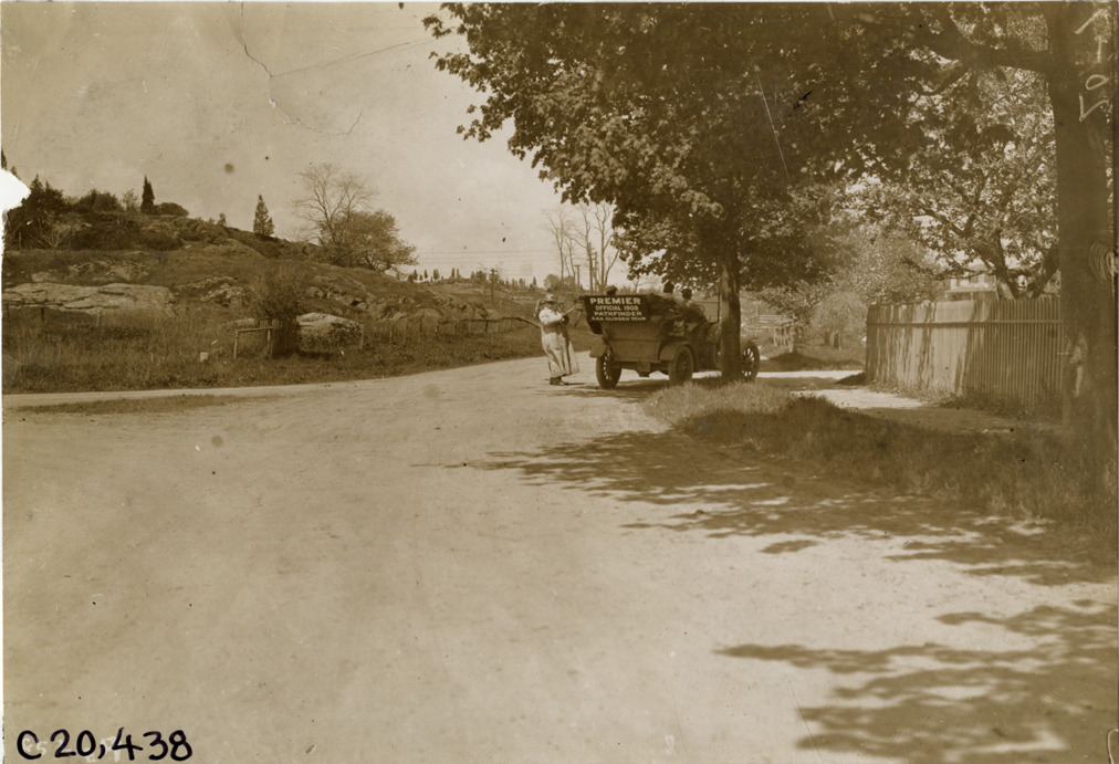 Motorists with Premier automobile stopping on rural road, 1908 Glidden pathfinding expedition