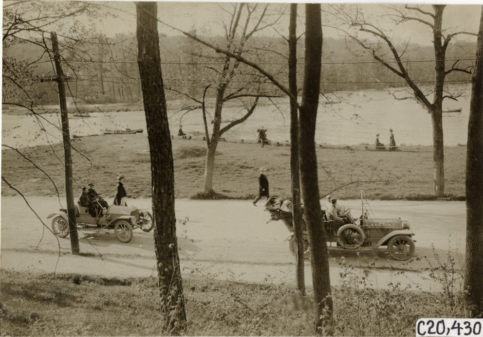 View of motorists in two Premier cars passing canoeists at Norumbega Park in Auburndale, Massachusetts during the pathfinding expedition for the 1908 Glidden Tour. Stamped on back: "Photo by N. Lazarnick, 29 West 42nd Street, N.Y., tel. 594 Bryant." Handwritten on back: "Norumbega Park on Charles River. Tours--Glidden Tour Pathfinder, 1908."