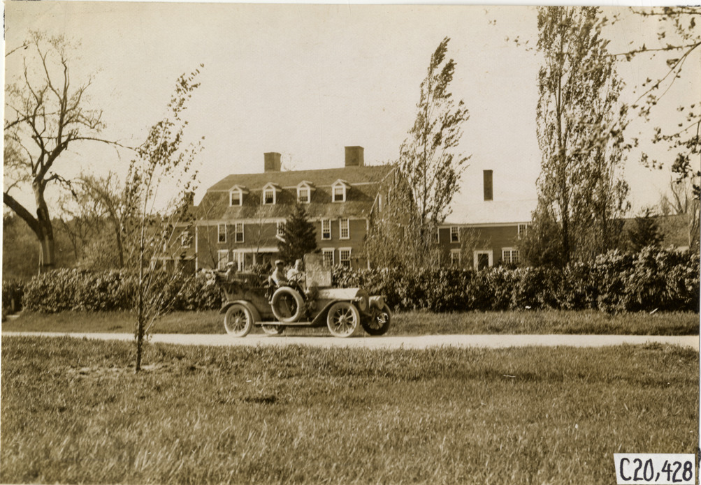 View of motorists in Premier car passing Longfellow's Wayside Inn at Sudbury, Massachusetts during the pathfinding expedition for the 1908 Glidden Tour. Stamped on back: "Photo by N. Lazarnick, 29 West 42nd Street, N.Y., tel. 594 Bryant." Handwritten on back: "Tours--Glidden Tour Pathfinder, 1908."