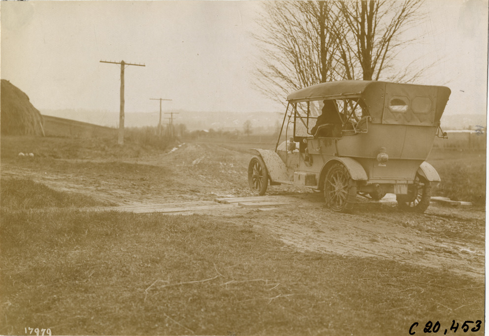 Motorists in Premier automobile traveling on rural road, 1908 Glidden pathfinding expedition