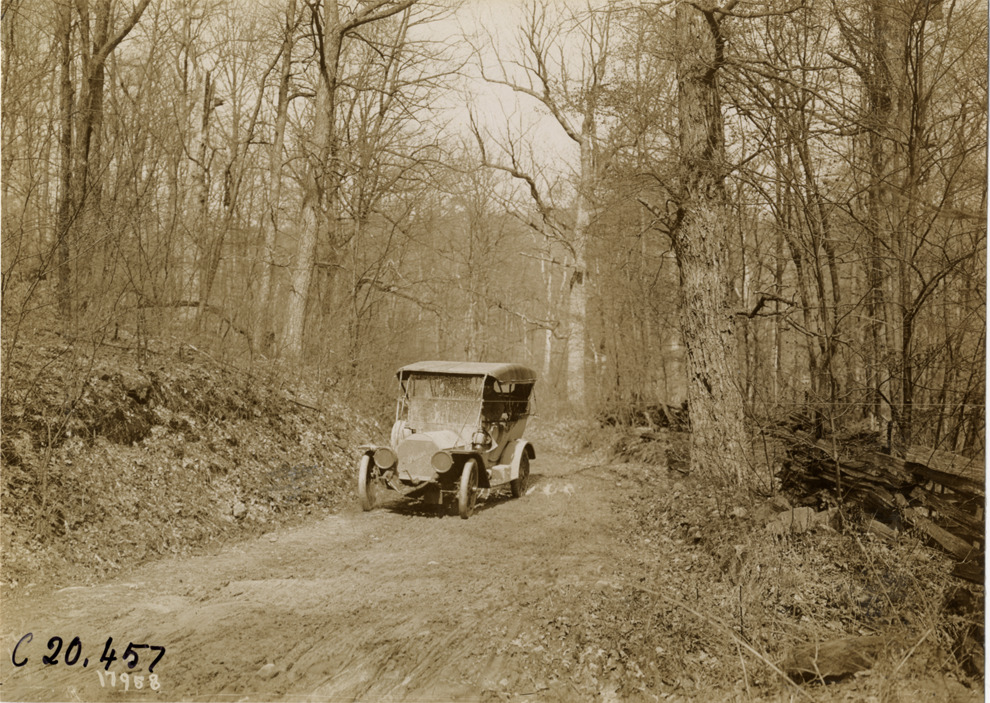 Premier automobile traveling on rural road, 1908 Glidden pathfinding expedition