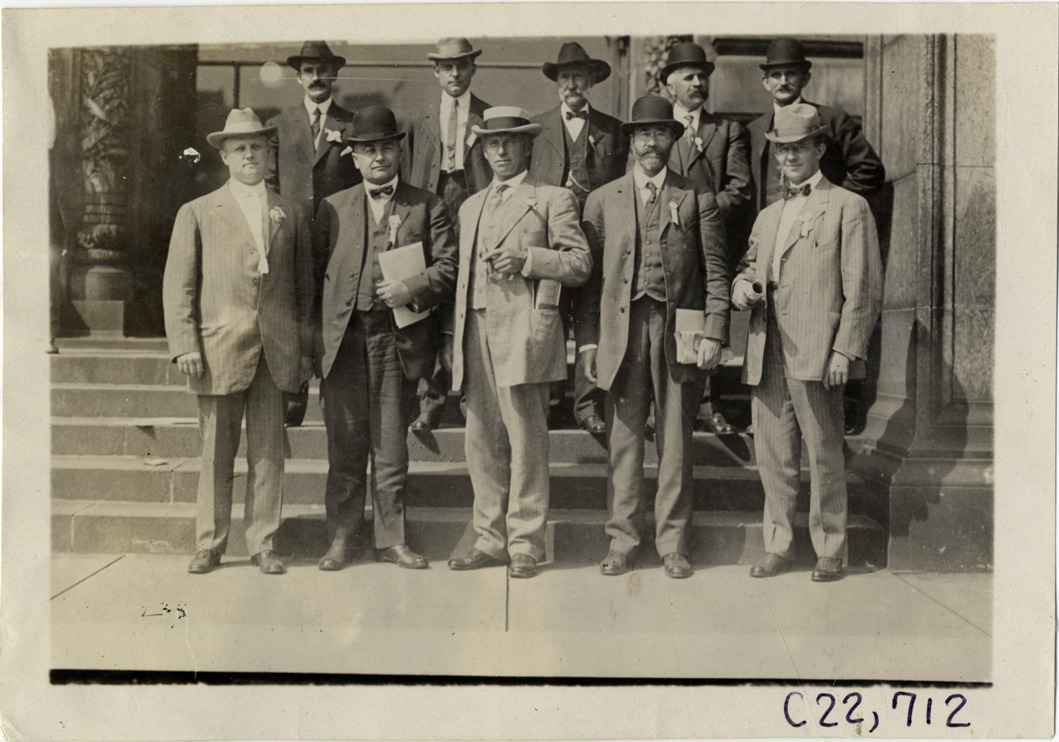 Group portrait of officials during the 1909 Glidden Tour. Handwritten on back: "Tours--Glidden Tour, 1909."