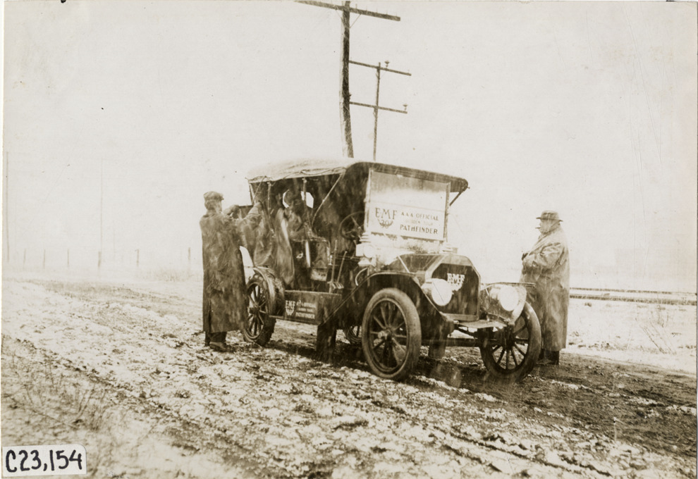Motorists with E-M-F automobile on snowy day, 1909 Glidden pathfinding expedition