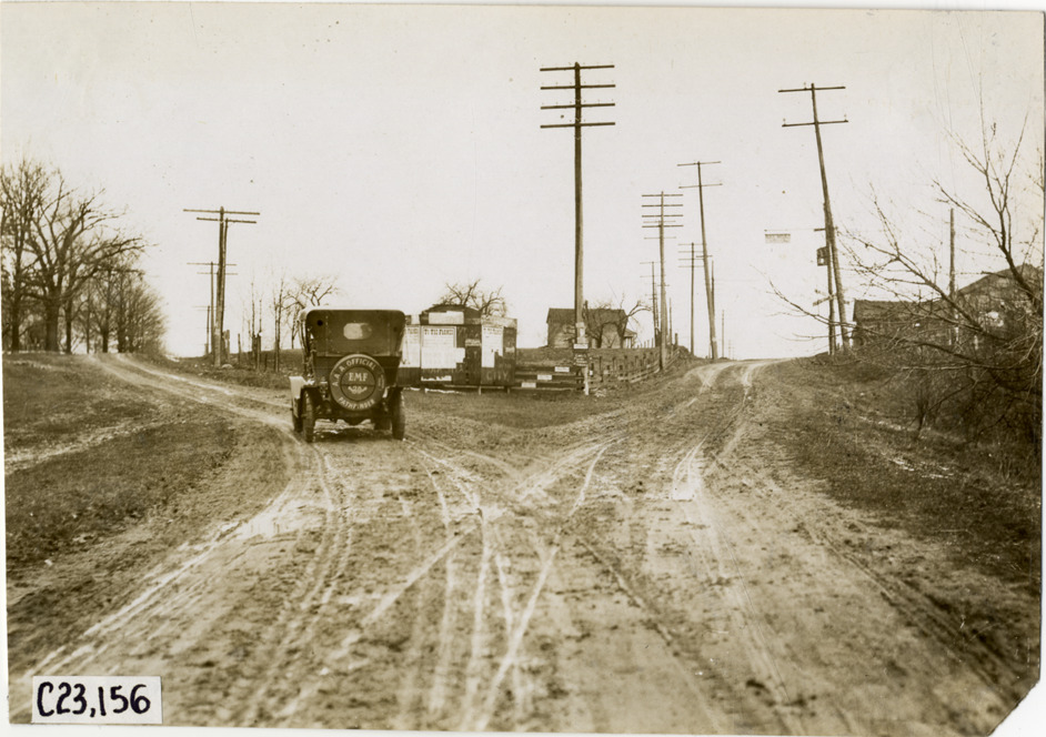 Favorite this☆ E-M-F automobile at fork in road, 1909 Glidden pathfinding expedition Description: Rear view of E-M-F car at fork in road during the pathfinding expedition for the 1909 Glidden Tour. Handwritten on back: "Tours--Glidden Tour Pathfinder, 1909." Details Resource ID: na024367 Subject: Automobiles E-M-F Company Dirt roads Glidden Tour (1909) Automobile travel Photographic prints Date Issued: 1909 Format: 1 photographic print ; 4.5 x 6.25 in. Member of: National Automotive History Collection Lazarnick Collection Filing Location: Tours--Glidden Tour Pathfinder, 1909 #1 Negative Number: Negative #C23,156 Rights: Physical rights are retained by DPL. Copyright is retained in accordance with U.S. copyright laws.