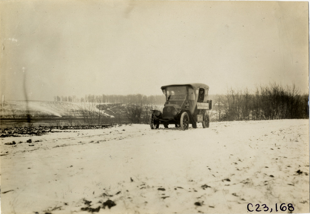 View of E-M-F car traveling on snow-covered rural road during the pathfinding expedition for the 1909 Glidden Tour. Handwritten on back: "Tours--Glidden Tour Pathfinder, 1909."