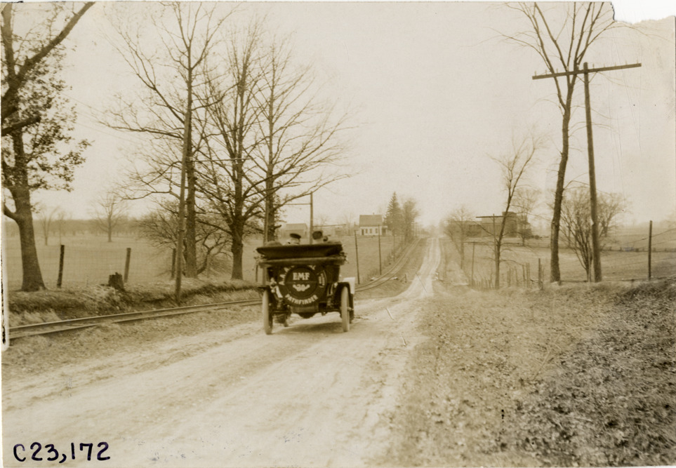 E-M-F automobile traveling on rural road, 1909 Glidden pathfinding expedition