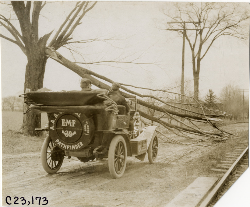 Motorists in E-M-F automobile approaching downed tree limb on road, 1909 Glidden pathfinding expedition