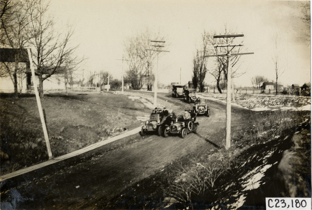 Distant view of motorists in E-M-F car and Buick cars traveling on dirt road during the pathfinding expedition for the 1909 Glidden Tour. Handwritten on back: "Tours--Glidden Tour Pathfinder, 1909."