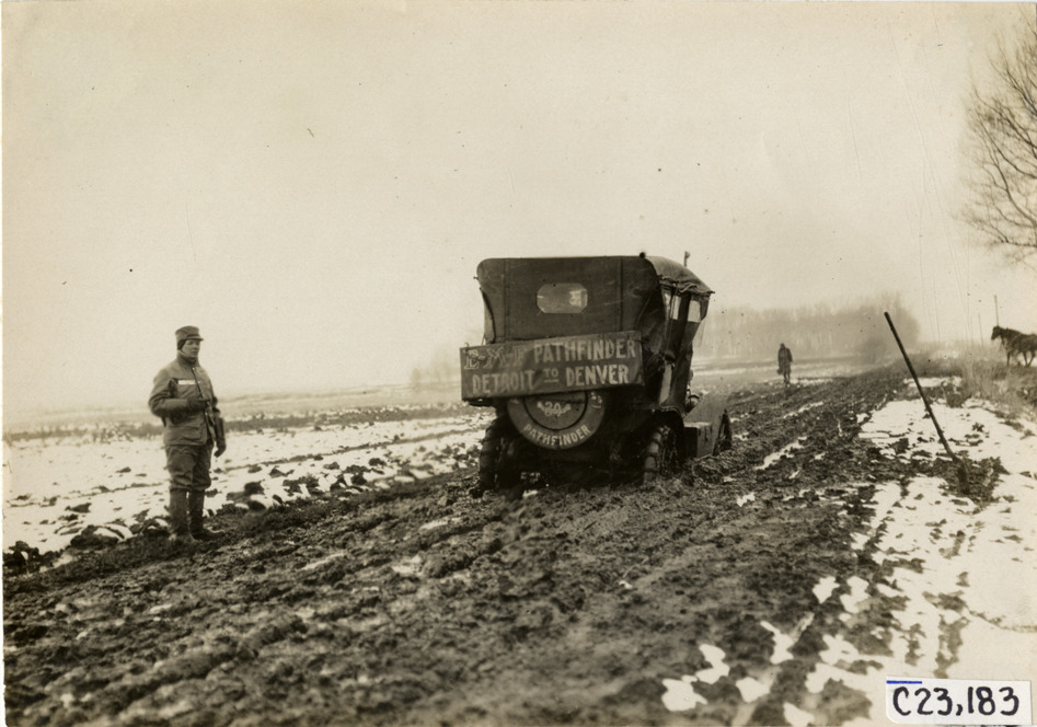 Rear view of E-M-F car traveling on muddy rural road during the pathfinding expedition for the 1909 Glidden Tour. Man stands on roadside; "E-M-F pathfinder, Detroit to Denver" sign is displayed on back of car. Handwritten on back: "Tours--Glidden Tour Pathfinder, 1909."