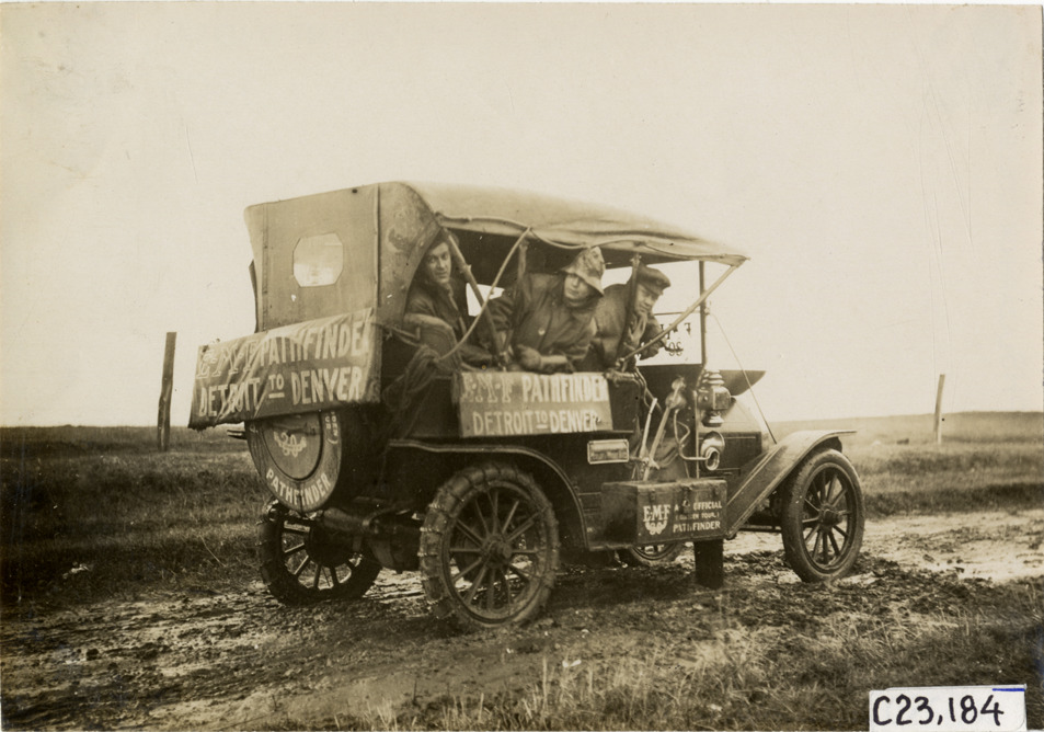 Rear view of E-M-F car traveling on muddy rural road during the pathfinding expedition for the 1909 Glidden Tour. Man stands on roadside; "E-M-F pathfinder, Detroit to Denver" signs are displayed on car. Handwritten on back: "Tours--Glidden Tour Pathfinder, 1909."