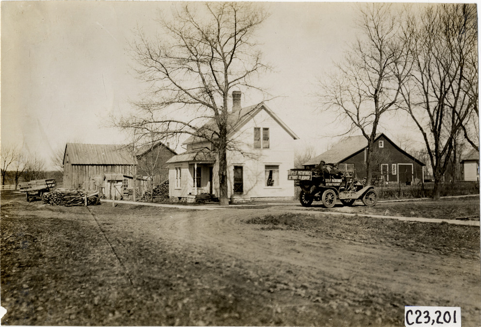 Motorists in E-M-F automobile passing farmhouse and barns, 1909 Glidden pathfinding expedition