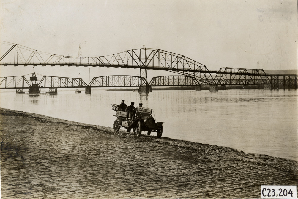 View of motorists posing in E-M-F car on shoreline during the pathfinding expedition for the 1909 Glidden Tour. Bridges in background. Handwritten on back: "Tours--Glidden Tour Pathfinder, 1909."