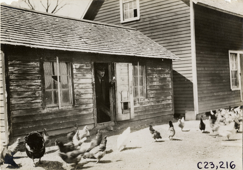 View of man standing in doorway of wooden-frame chicken coop during the pathfinding expedition for the 1909 Glidden Tour. Flock of chickens in foreground. Handwritten on back: "Tours--Glidden Tour Pathfinder, 1909."