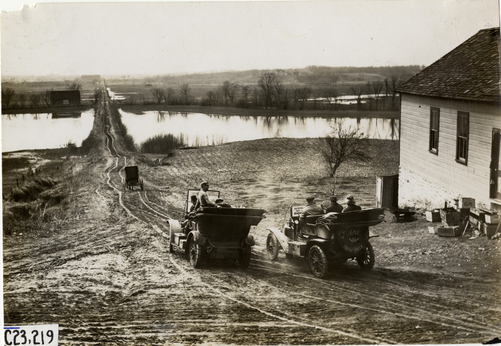 Automobiles stopping on rural dirt road near pond, 1909 Glidden pathfinding expedition