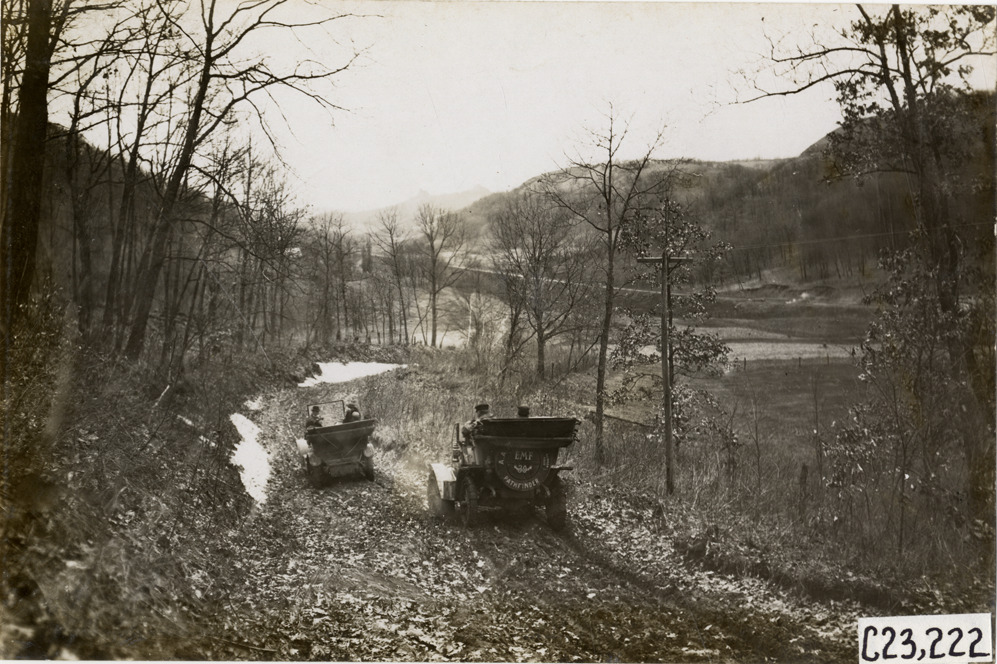 Rear view of motorists in two cars traveling on mountain road during the pathfinding expedition for the 1909 Glidden Tour. E-M-F pathfinder car on right. Handwritten on back: "Tours--Glidden Tour Pathfinder, 1909."