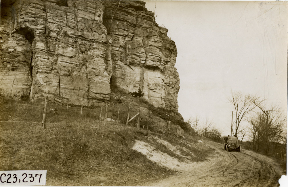 View of motorists in E-M-F car passing rock formation near Wonewoc, Wisconsin during the pathfinding expedition for the 1909 Glidden Tour. Handwritten on back: "Tours--Glidden Tour Pathfinder, 1909."