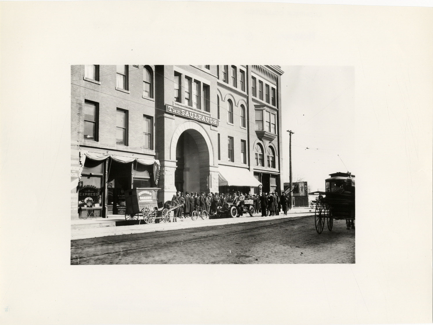Crowd surrounding E-M-F automobile in front of Saulpaugh Hotel, Mankato, Minnesota, 1909 Glidden pathfinding expedition