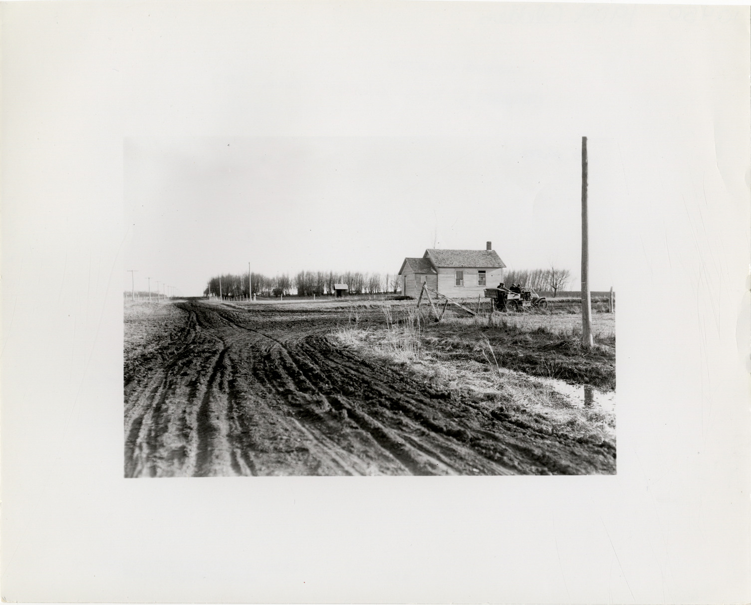 View of motorists in E-M-F car turning corner on rural dirt road during the pathfinding expedition for the 1909 Glidden Tour. Wooden-frame house in background. Handwritten on back: "Tours--Glidden Tour Pathfinder, 1909."