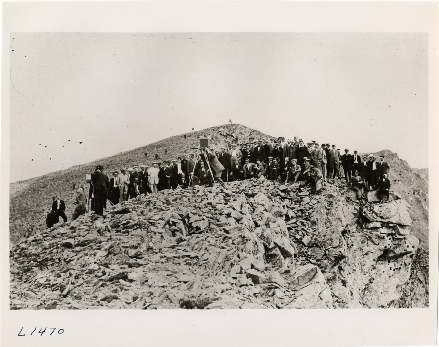 View of photographers, with two cameras on tripods, taking pictures of large group of men on rocky slope during the pathfinding expedition for the 1909 Glidden Tour. Handwritten on back: "1909 Glidden Tour, Detroit to Denver, making pictures for the record. Tours--Glidden Tour Pathfinder, 1909."