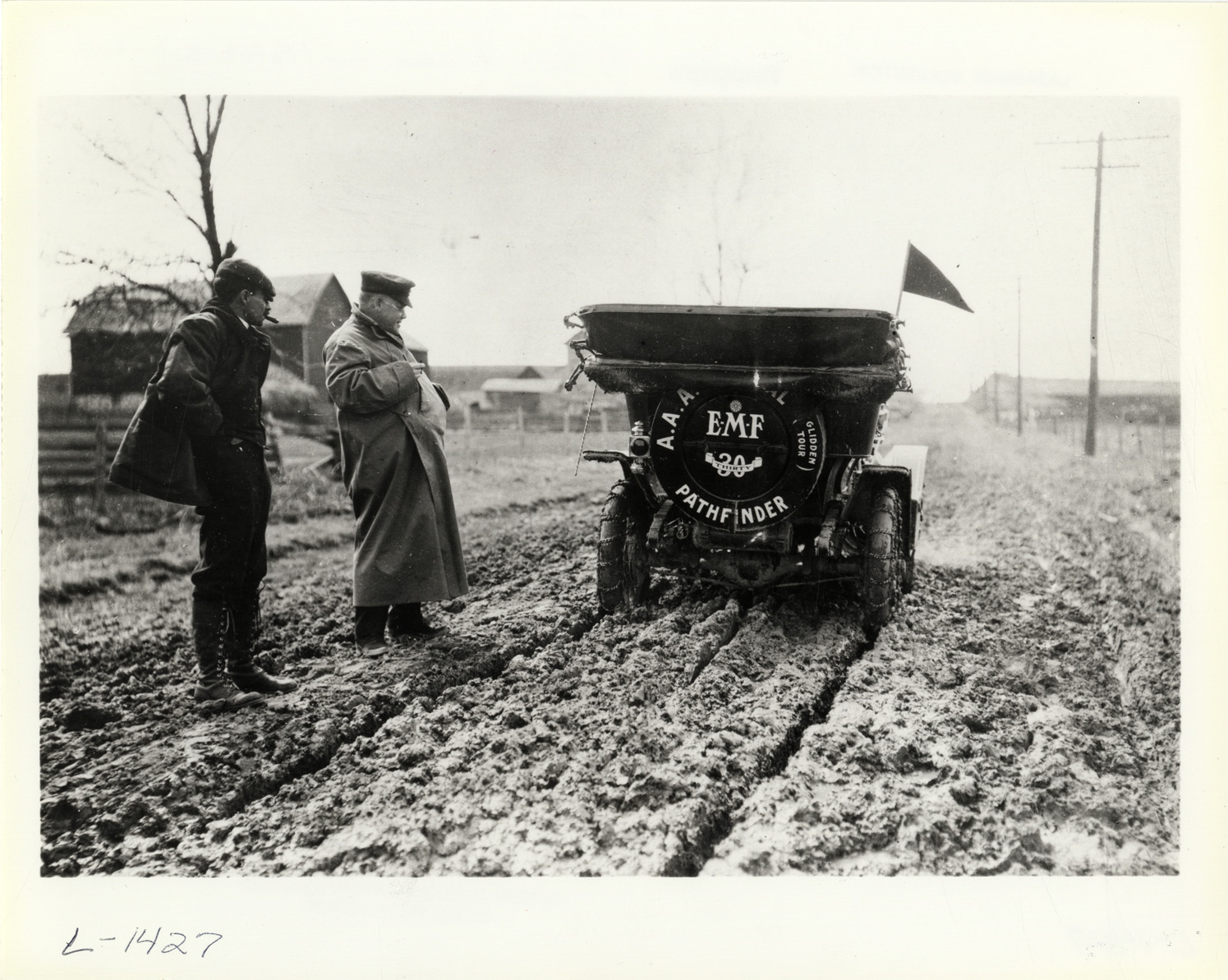 View of Dai H. Lewis and motorist looking at E-M-F car on muddy rural road during the pathfinding expedition for the 1909 Glidden Tour. Typed on back: "E-M-F pathfinder car on the 1909 Glidden Tour." Handwritten on back: "Tours--Glidden Tour Pathfinder, 1909."