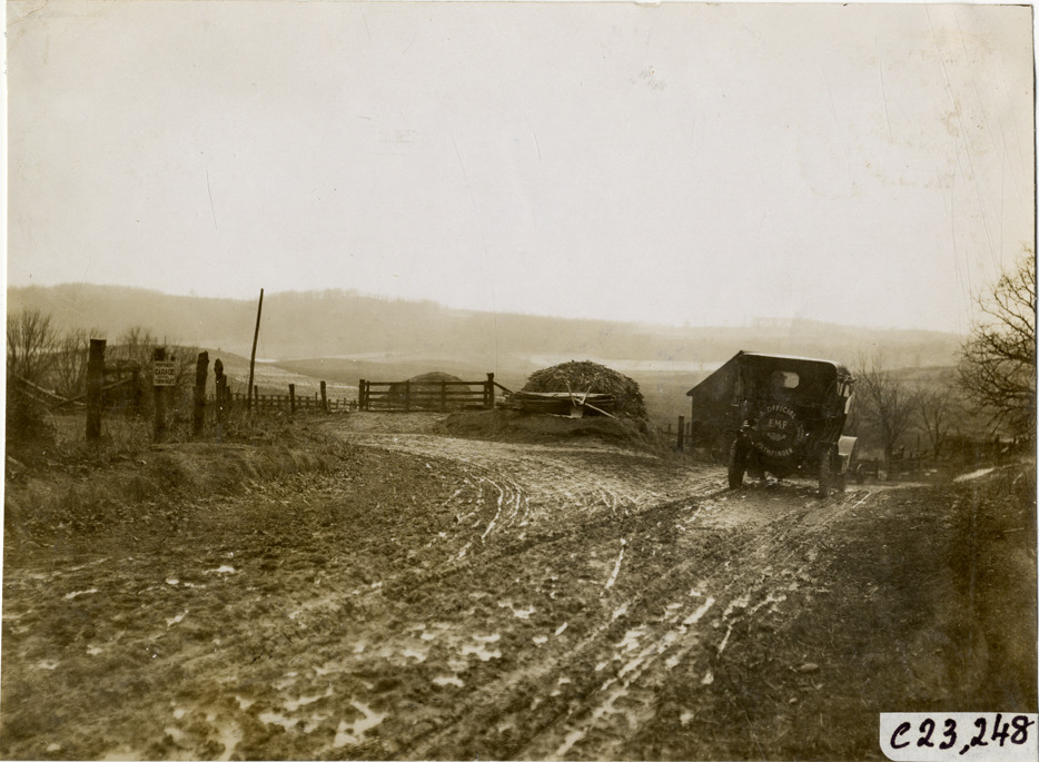 Rear view of E-M-F car traveling on muddy rural road during the pathfinding expedition for the 1909 Glidden Tour. Handwritten on back: "Tours--Glidden Tour Pathfinder, 1909."
