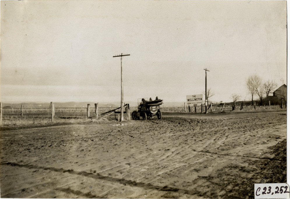 Rear view of motorists in E-M-F car turning corner on rural dirt road during the pathfinding expedition for the 1909 Glidden Tour. Sign advertising the Wellington Hotel in background. Handwritten on back: "Tours--Glidden Tour Pathfinder, 1909."