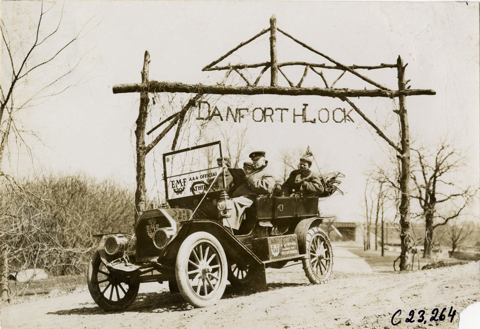 Dai Lewis and motorists in E-M-F automobile at entrance to Danforth Lock, 1909 Glidden pathfinding expedition