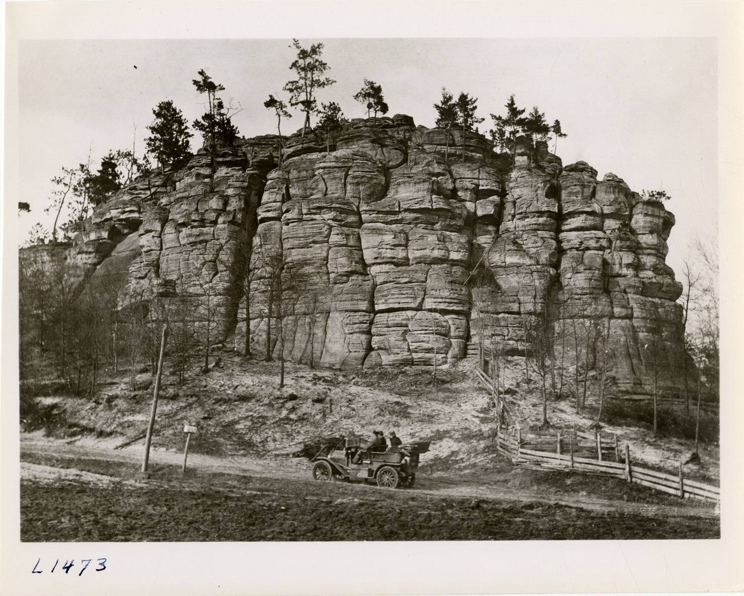 View of motorists in E-M-F car passing rock formation near Wonewoc, Wisconsin during the pathfinding expedition for the 1909 Glidden Tour. Handwritten on back: "Rock formation near Wonewoc, Wisconsin. 1909 Glidden Tour, Detroit to Denver, sometimes the scenery was beautiful. Tours--Glidden Tour Pathfinder, 1909."