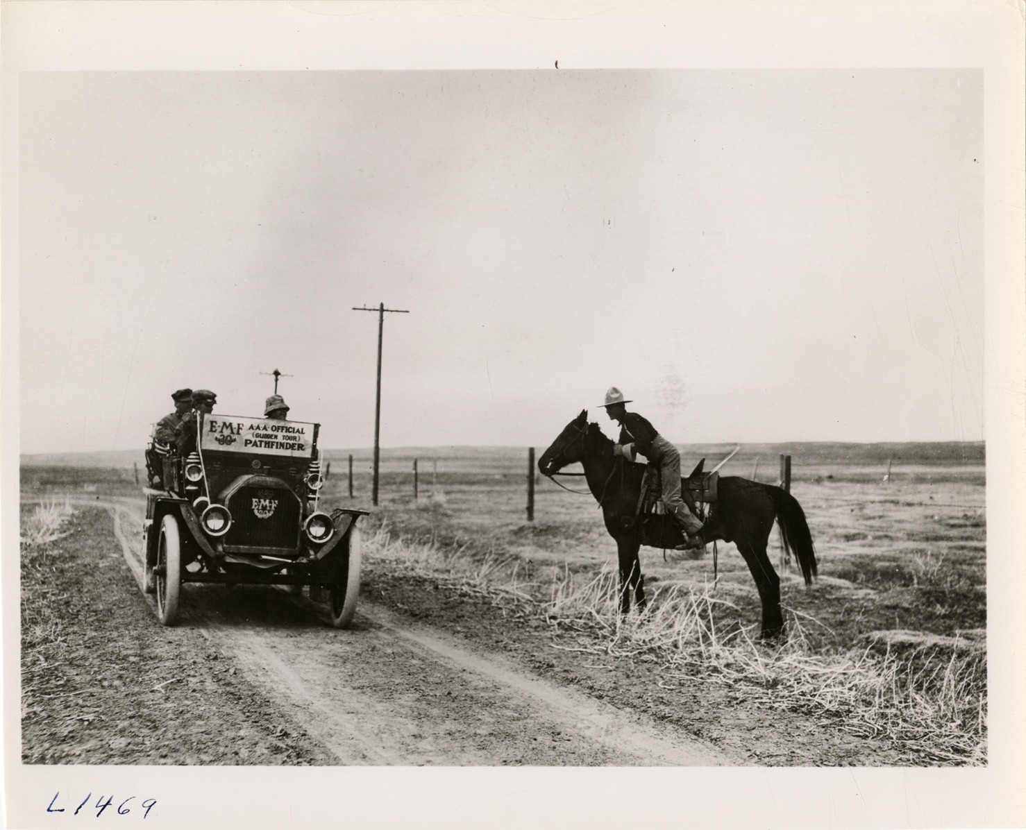 View of motorists in E-M-F car greeting cavalry soldier on horseback during the pathfinding expedition for the 1909 Glidden Tour. Handwritten on back: "Tours--Glidden Tour Pathfinder, 1909."