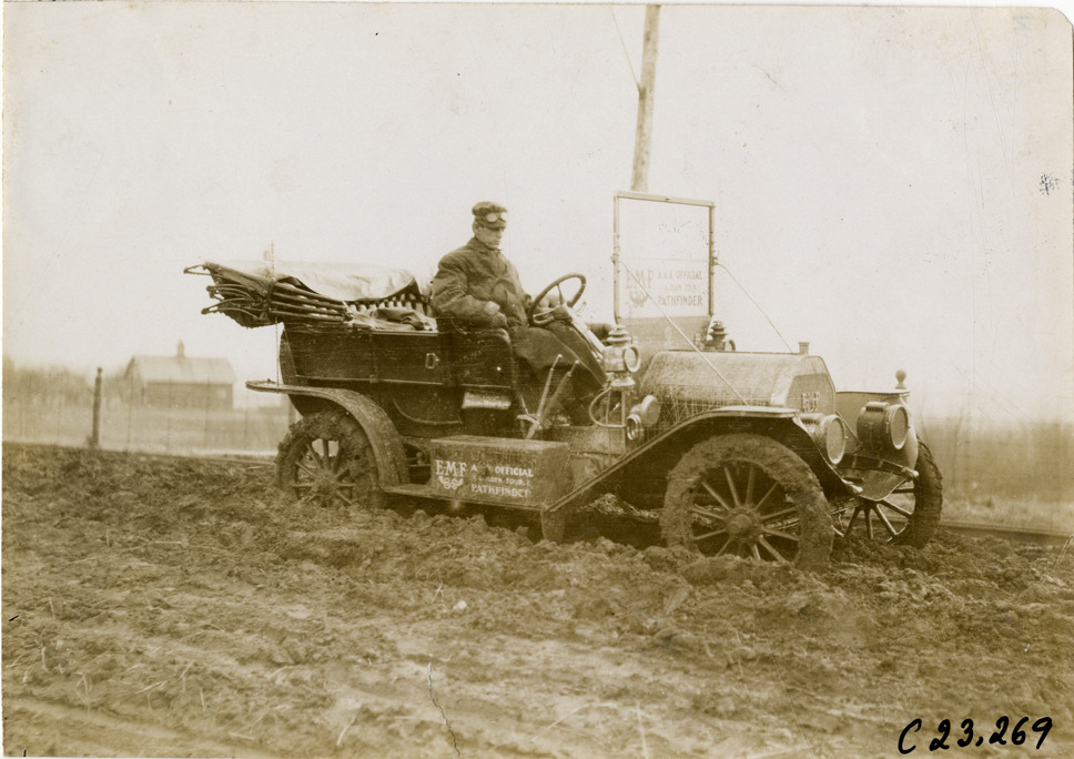 Favorite this☆ Driver in E-M-F automobile, 1909 Glidden pathfinding expedition Description: View of driver in E-M-F car during the pathfinding expedition for the 1909 Glidden Tour. Handwritten on back: "Tours--Glidden Tour Pathfinder, 1909." Details Resource ID: na024496 Subject: Automobiles E-M-F Company Automobile drivers Glidden Tour (1909) Automobile travel Photographic prints Date Issued: 1909 Format: 1 photographic print ; 4.5 x 6.5 in. Member of: National Automotive History Collection Lazarnick Collection Filing Location: Tours--Glidden Tour Pathfinder, 1909 #6 Negative Number: Negative #C23,269 Rights: Physical rights are retained by DPL. Copyright is retained in accordance with U.S. copyright laws.