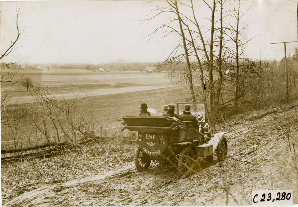 Rear view of motorists in E-M-F car traveling on rural dirt road during the pathfinding expedition for the 1909 Glidden Tour. Handwritten on back: "Tours--Glidden Tour Pathfinder, 1909."