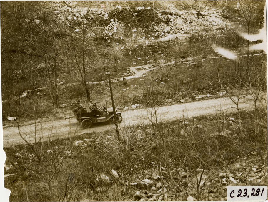 Bird's-eye view of motorists in E-M-F car traveling on mountain road during the pathfinding expedition for the 1909 Glidden Tour. Handwritten on back: "Tours--Glidden Tour Pathfinder, 1909."