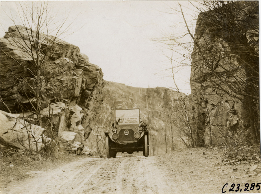 View of motorists in E-M-F car traveling past rock formations during the pathfinding expedition for the 1909 Glidden Tour. Handwritten on back: "Tours--Glidden Tour Pathfinder, 1909."