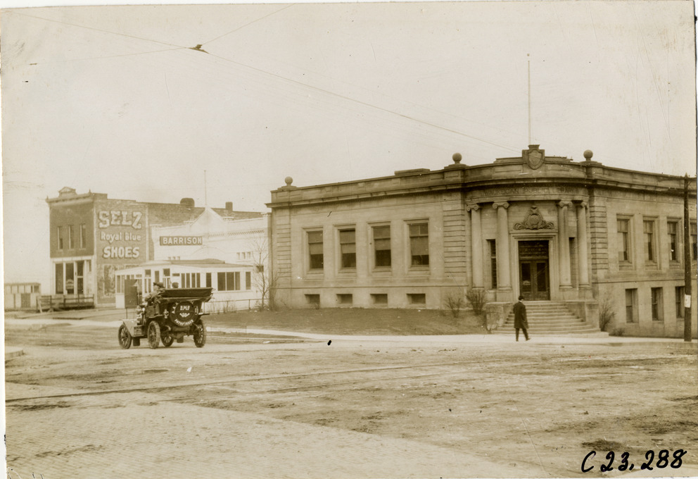 Rear view of motorists in E-M-F car passing Waukegan Public Library in Illinois during the pathfinding expedition for the 1909 Glidden Tour. Brick wall sign advertising Selz Royal Blue shoes in background. Handwritten on back: "Tours--Glidden Tour Pathfinder, 1909."