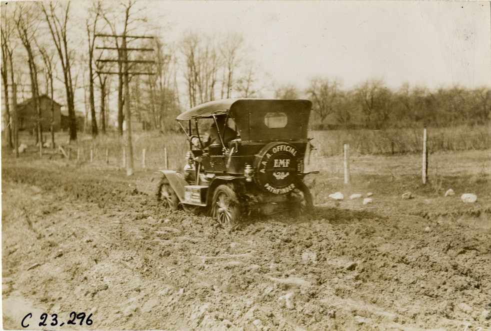 Favorite this☆ E-M-F automobile stuck on muddy rural road, 1909 Glidden pathfinding expedition Description: Rear view of E-M-F car stuck on muddy rural road during the pathfinding expedition for the 1909 Glidden Tour. "A.A.A. official E-M-F pathfinder" is painted on wheel cover. Handwritten on back: "Tours--Glidden Tour Pathfinder, 1909." Details Resource ID: na024523 Subject: Automobiles E-M-F Company Dirt roads Glidden Tour (1909) Automobile travel Photographic prints Date Issued: 1909 Format: 1 photographic print ; 4.5 x 6.5 in. Member of: National Automotive History Collection Lazarnick Collection Filing Location: Tours--Glidden Tour Pathfinder, 1909 #7 Negative Number: Negative #C23,296 Rights: Physical rights are retained by DPL. Copyright is retained in accordance with U.S. copyright laws.