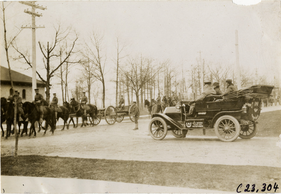View of motorists in E-M-F car watching soldiers on horseback during the pathfinding expedition for the 1909 Glidden Tour. Handwritten on back: "Tours--Glidden Tour Pathfinder, 1909."