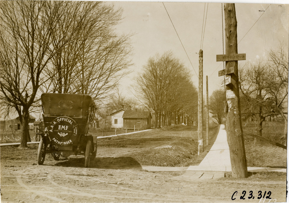 Rear view of E-M-F car on rural road in Indiana during the pathfinding expedition for the 1909 Glidden Tour. Mileage signs for Michigan City, Valparaiso and La Porte on utility pole in foreground. Handwritten on back: "Tours--Glidden Tour Pathfinder, 1909."