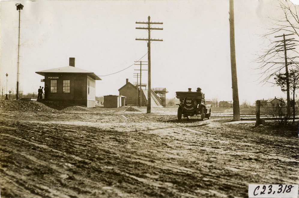 Rear view of motorists in E-M-F car traveling past Pokagon train station during the pathfinding expedition for the 1909 Glidden Tour. Handwritten on back: "Tours--Glidden Tour Pathfinder, 1909."