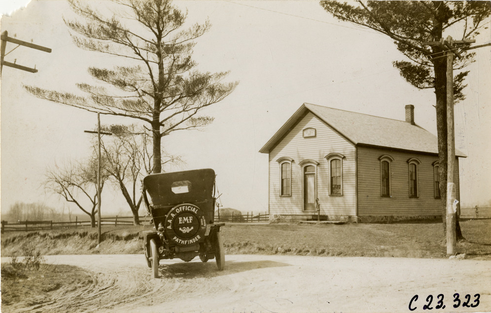 Rear view of motorists in E-M-F car traveling past wooden-frame rural schoolhouse during the pathfinding expedition for the 1909 Glidden Tour. Sign over doorway on school reads: "Public school no. 5, 1887." Handwritten on back: "Tours--Glidden Tour Pathfinder, 1909."