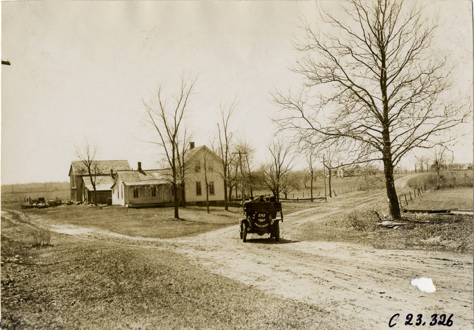 Rear view of motorists in E-M-F car traveling past farmhouse on rural road during the pathfinding expedition for the 1909 Glidden Tour. Handwritten on back: "Tours--Glidden Tour Pathfinder, 1909."