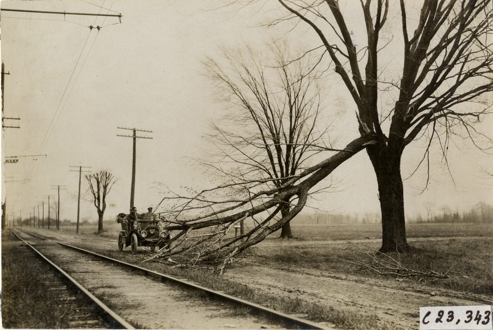 Motorists in E-M-F automobile approaching downed tree limb on road, 1909 Glidden pathfinding expedition